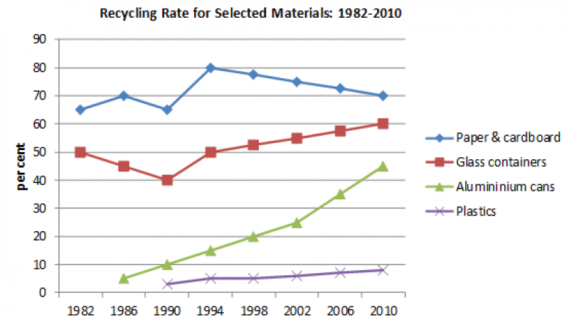 Overall, the most noticeable trend is that the recycling percentage of all items increased throughout the period apart from paper and cardboard. The recycling rate of glass containers started at around 50% in 1982, apart from a small drop of about 40% till 1990, it increased gradually up to above 50% by the end of the period. Aluminium cans are the only item which had a sharp rise from nearly 4% to almost 45% from 1990 to 2010. The recycling rate of plastics followed the same pattern but steadily. It started with around 3% in 1990 and rose steadily to approximately 9% by 2010. The recycling ratio of paper and cardboard fluctuated between around 65% and 80% between 1982 and 1994 before declining approximately to 70% in 2010.