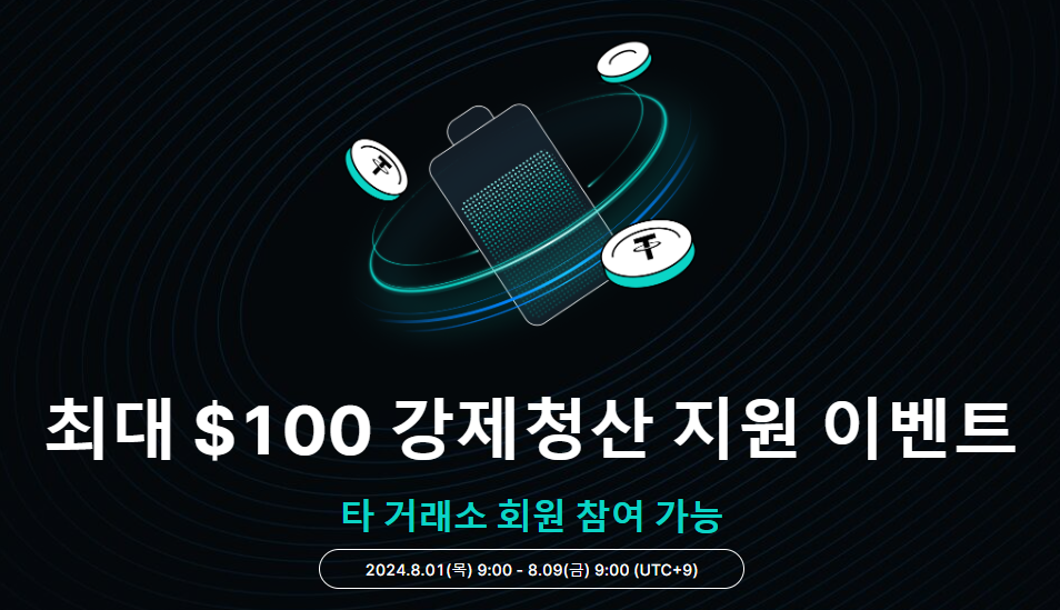 이벤트 기간 내 다른 거래소에서 선물 포지션이 강제청산 시 구글폼에 청산 기록 스크린샷을 업로드하면 청산 금액의 최대 100%를 청산 지원금으로 지급(1인당 최대 50 USDT 증정금)