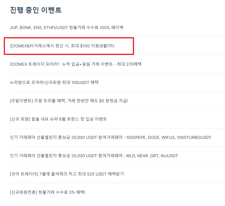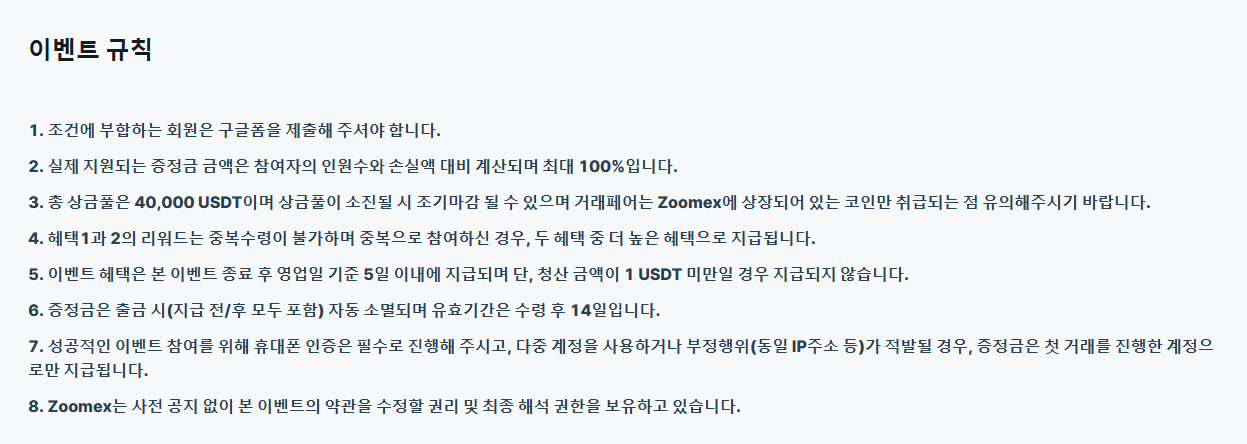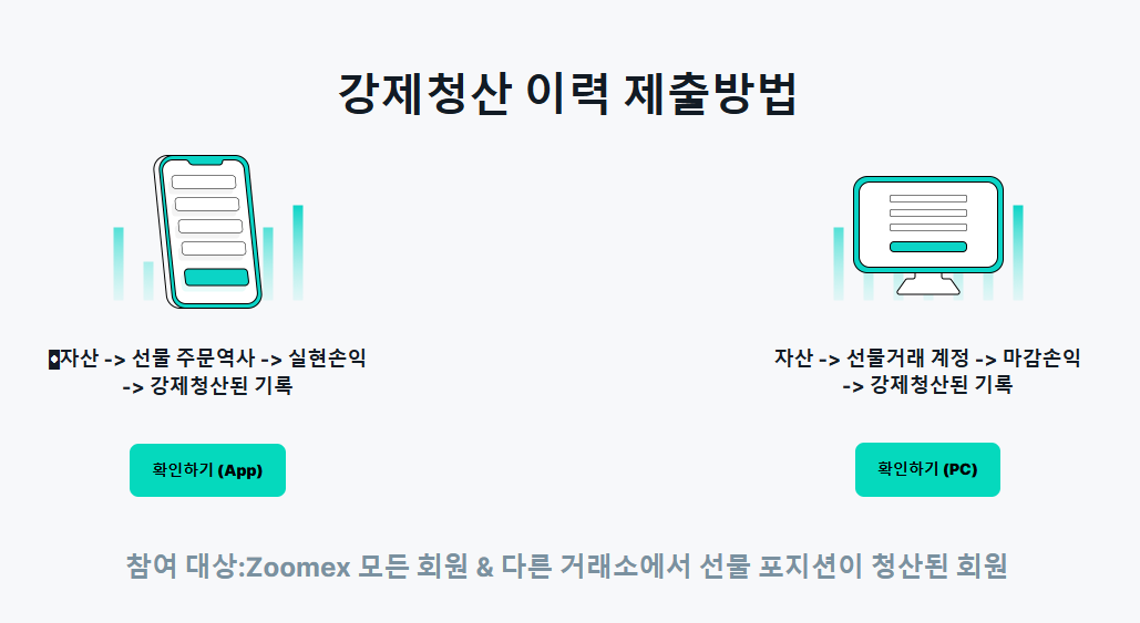 이벤트 기간 내 Zoomex에서 선물 포지션이 강제청산된 회원 중 구글폼을 작성 시 청산 금액의 최대 100%를 청산 지원금으로 지급(1인당 최대 100 USDT 증정금)