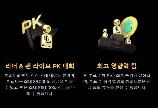 팀전은 리더와 팬의 라이브 PK 대회가 포함되는데요. 각각 거래 대결을 펼치는 내용으로 리더는 최대 8000달러 상금을 팬은 최대 15,000달러 상금을 나누어 받을 수 있습니다.